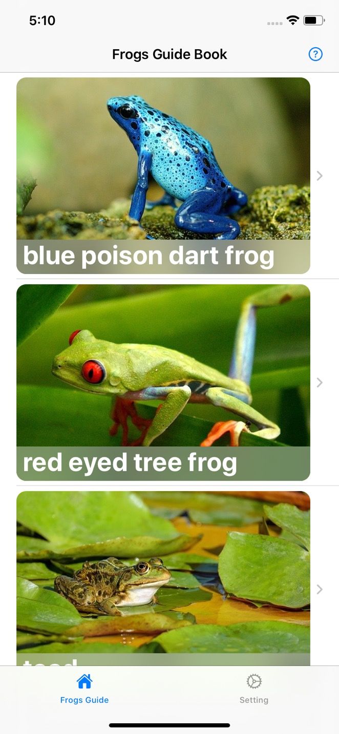 - List画面: カエルをカード型で表示します。タップするとそのカエルの詳細画面に遷移します。
