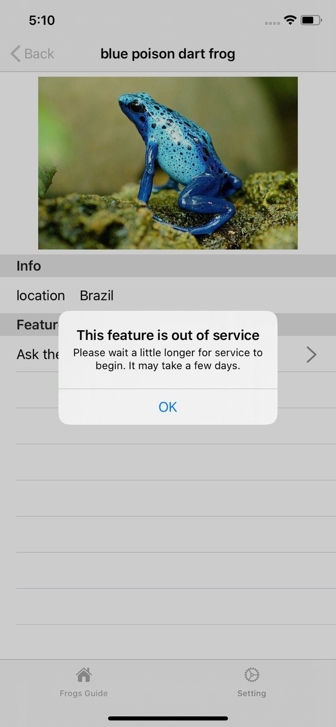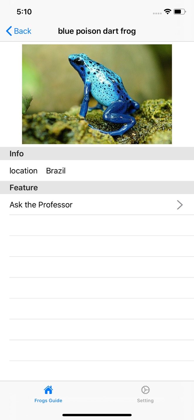- Detail画面: 選択されたカエルの詳細画面です。カエルの情報と「Ask The Professor」で専門家に質問できる機能があります。ただしこの機能は今は使えません。アラートで機能が使えない旨をユーザーに伝えます。
