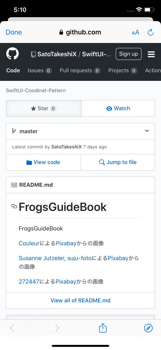 リスト画面のナビゲーションアイテムとしてアバウト画面へのリンクボタンを設置します。タップするとモーダル表示でカエル図鑑のGitHubリポジトリページをWebビューで表示します。