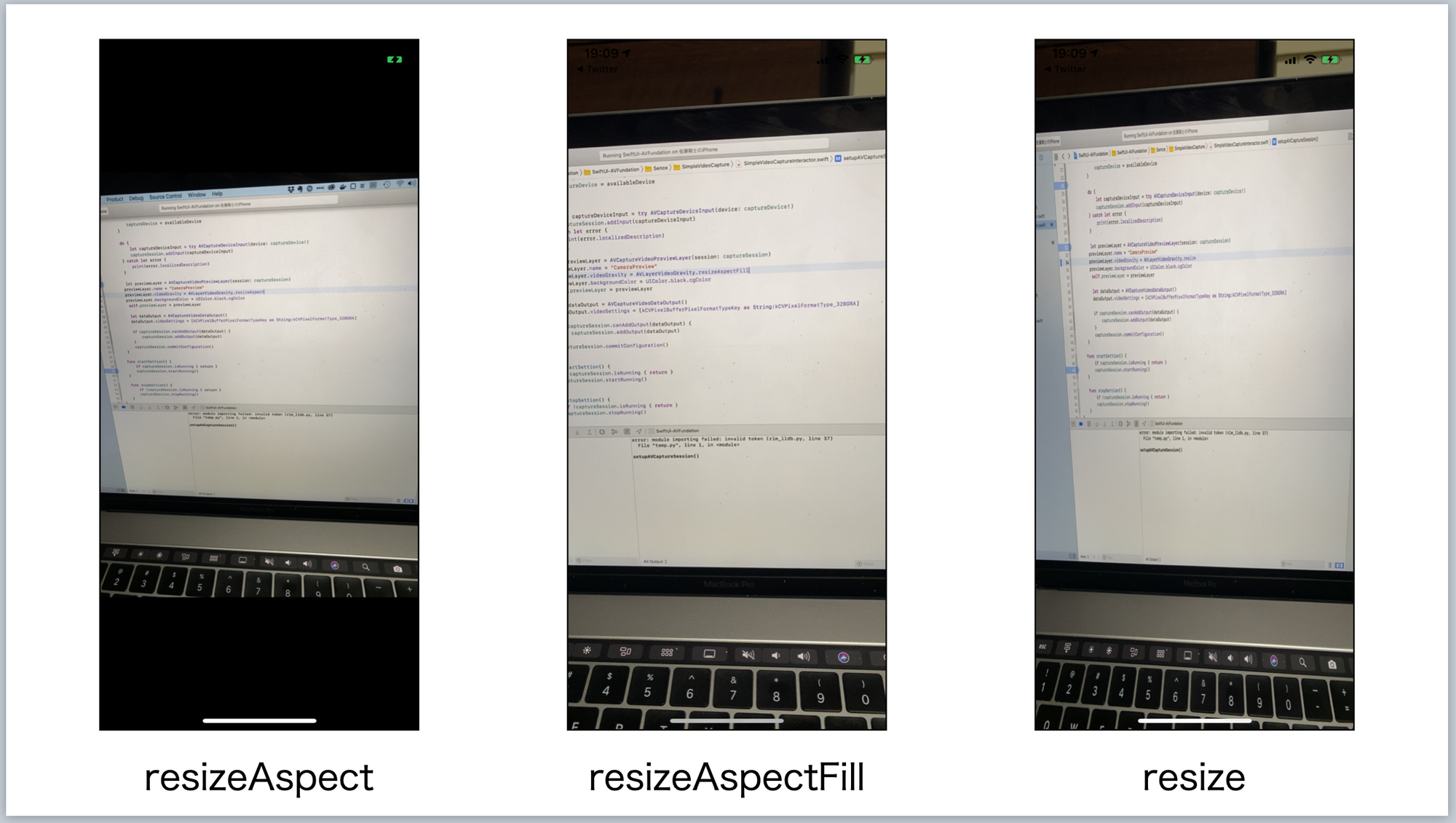 3つそれぞれ指定した場合のAVCaptureVideoPreviewLayerの表示をみてみます。