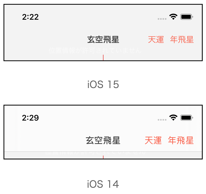 この適応はiOS 14以前では「大きなタイトル(ラージタイトル)」を持つNavigation Barのみでしたが、iOS 15ではすべてのNavigation Barに適応されたとのことです。